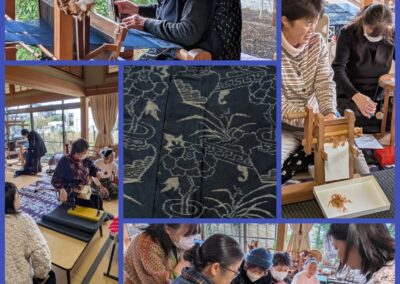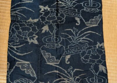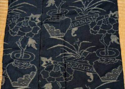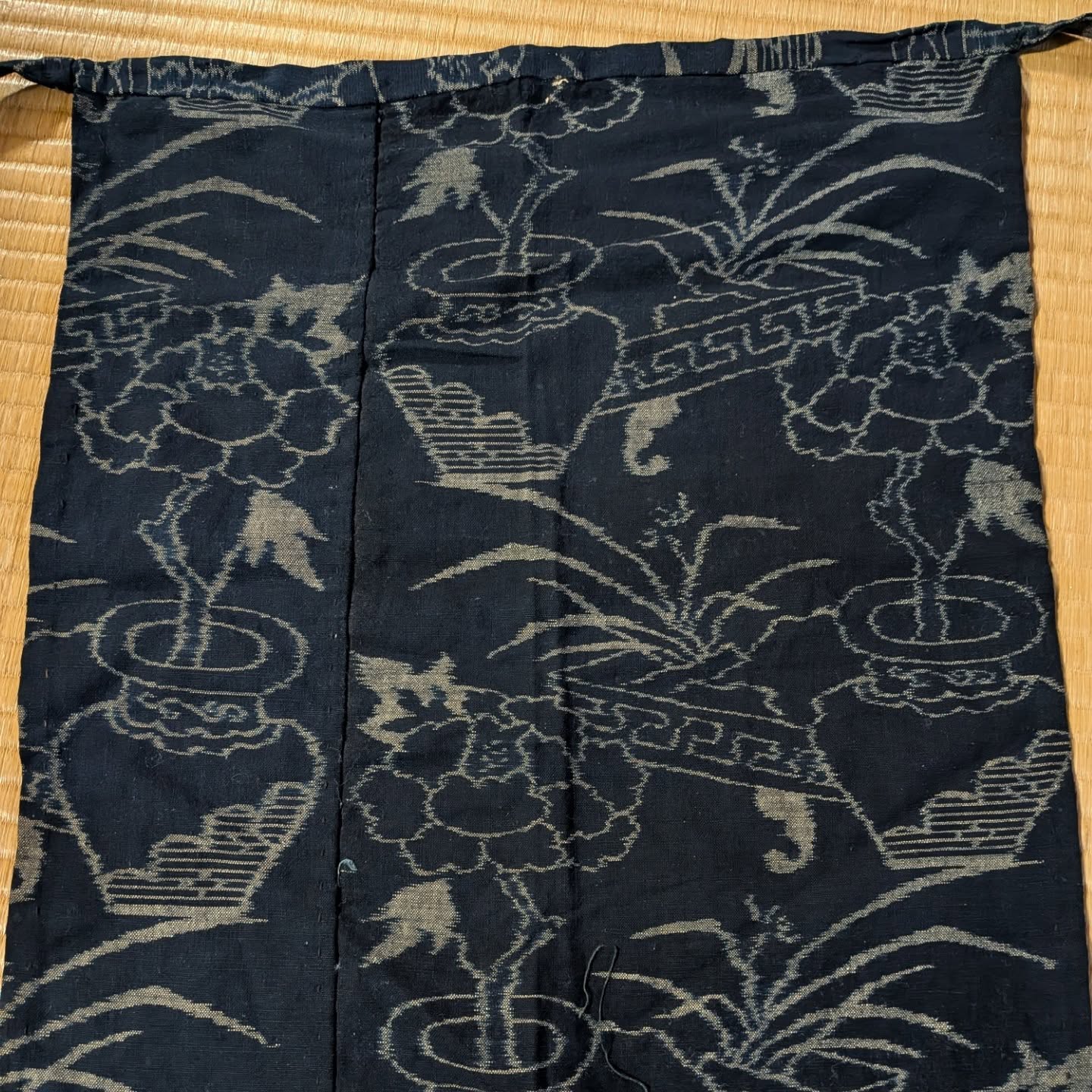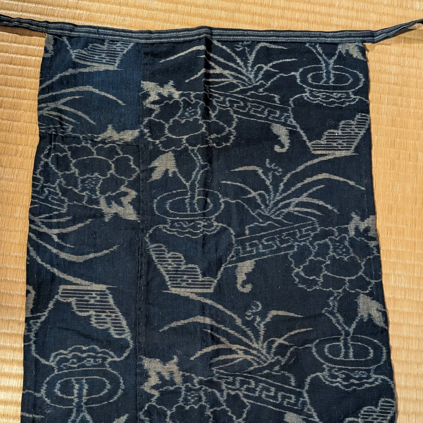 綿埃が多く出ますので、絣の前掛けを出して使いました。素敵な絵絣ですよね。