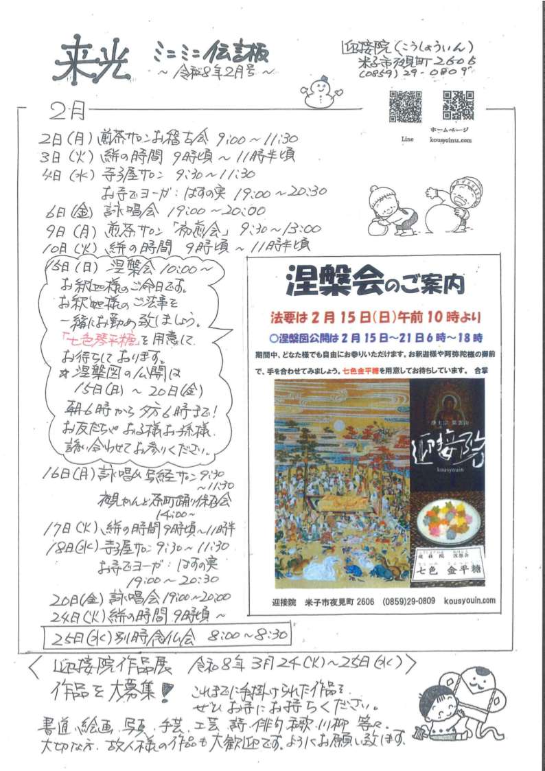 令和8年2月のミニミニ伝言板ができました。このところは雪が続き、春を待ちどおしく思いますね。皆さま、どうぞ暖かくしてお過ごしください。雪景色や、春待ちの今を愉しむことと致しましょう。2月は立春を過ぎますと、15日に涅槃会を致します。お釈迦様のご命日に、お釈迦様のご法事を営みます。涅槃図をおかけして、七色金平糖をご用意してお待ち申し上げます。ぜひ、お参りくださいませ。