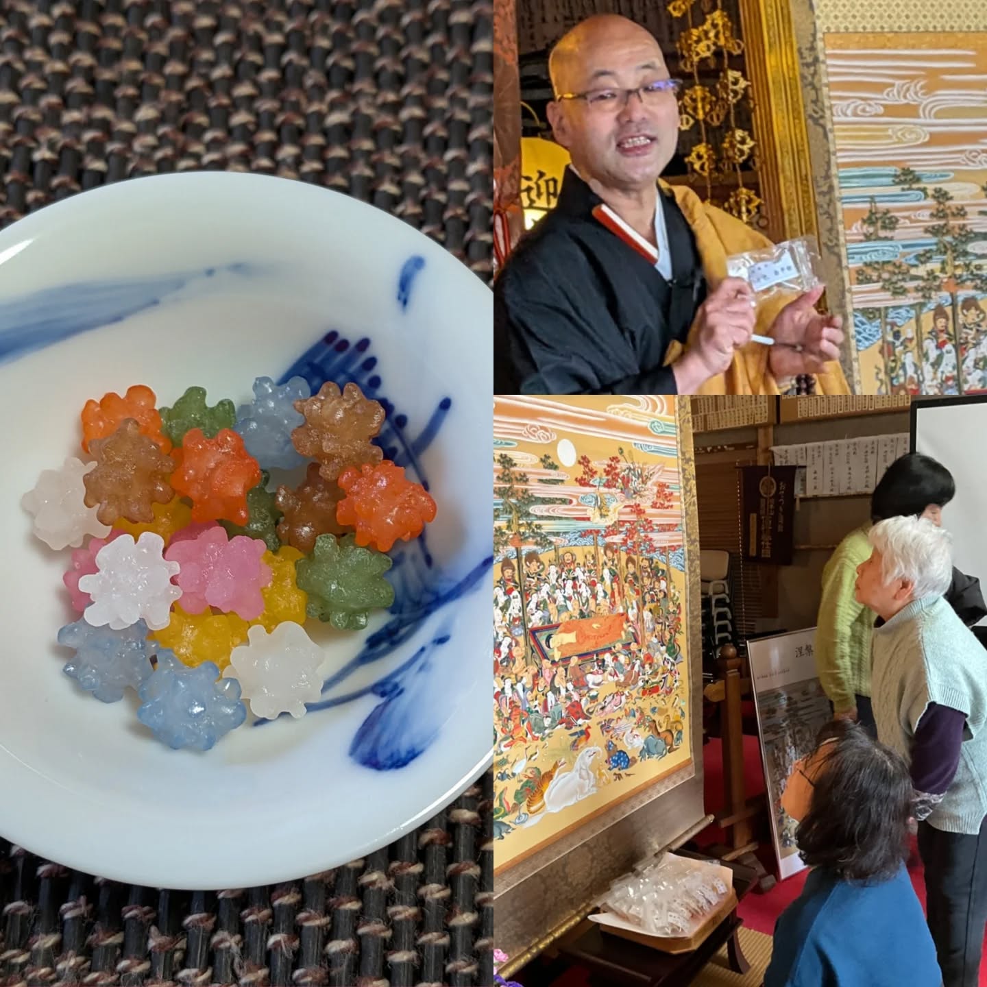 荼毘にふされた仏舎利が五色七色に輝いたということから、迎接院では「七色金平糖」をご用意しています。涅槃図を20日(金)まで、ご本堂でお祀りしております。朝6時から夕方6時まで、お参りいただけます。どなた様も、お気軽にお参りください。尚、期間中、法務や諸活動で本堂を利用する時間がございます。その際は入堂ができませんので、ご了承くださいませ。