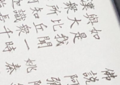 涅槃図公開中の、詠唱&写経サロンでした。まず、ご本堂で「月かげの御詠歌」「涅槃和讃」をお唱えし、続いて、「佛説阿弥陀経」の冒頭部分を読誦して、その読誦した部分を写経する流れでございました。