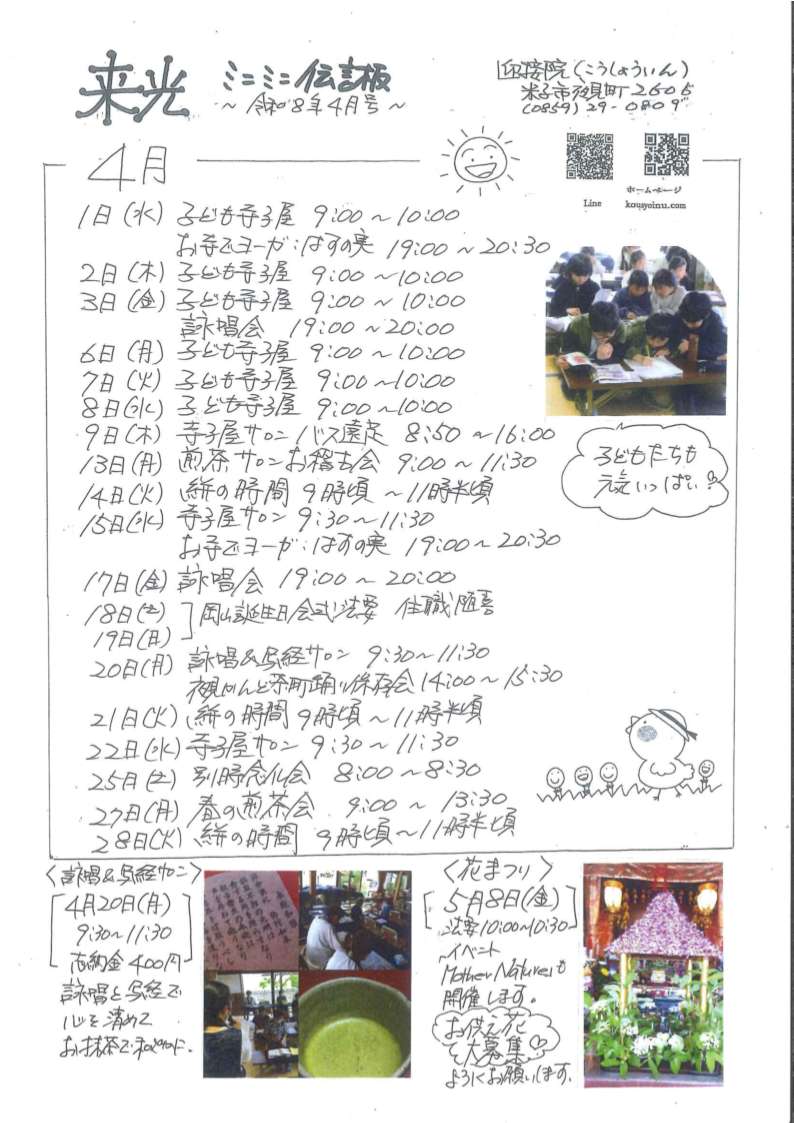 令和8年4月のミニミニ伝言板ができました。お彼岸過ぎて、一気に暖かくなりました。春の花も咲き始めましたね。お寺では、春休みの子ども寺子屋が始まっております。4月には新年度が始まります。子どもたちも大人も、わくわくの新年度を迎えましょう。お寺にもお参りくださいませ。