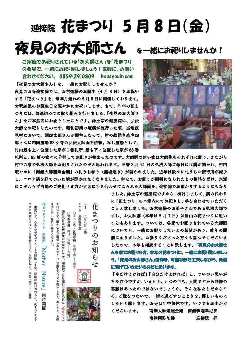 さらに、「夜見のお大師さん」を花まつりの会場で一緒におまつり致します。町内で開かれていたお大師講開催が困難になられたのと相談を受けて、当山で開催継続しようとの取り組みです。ご縁を繋いで、一緒に過ごすひとときを、優しいものに致しましょう。ご理解とご協力を、お願いします。